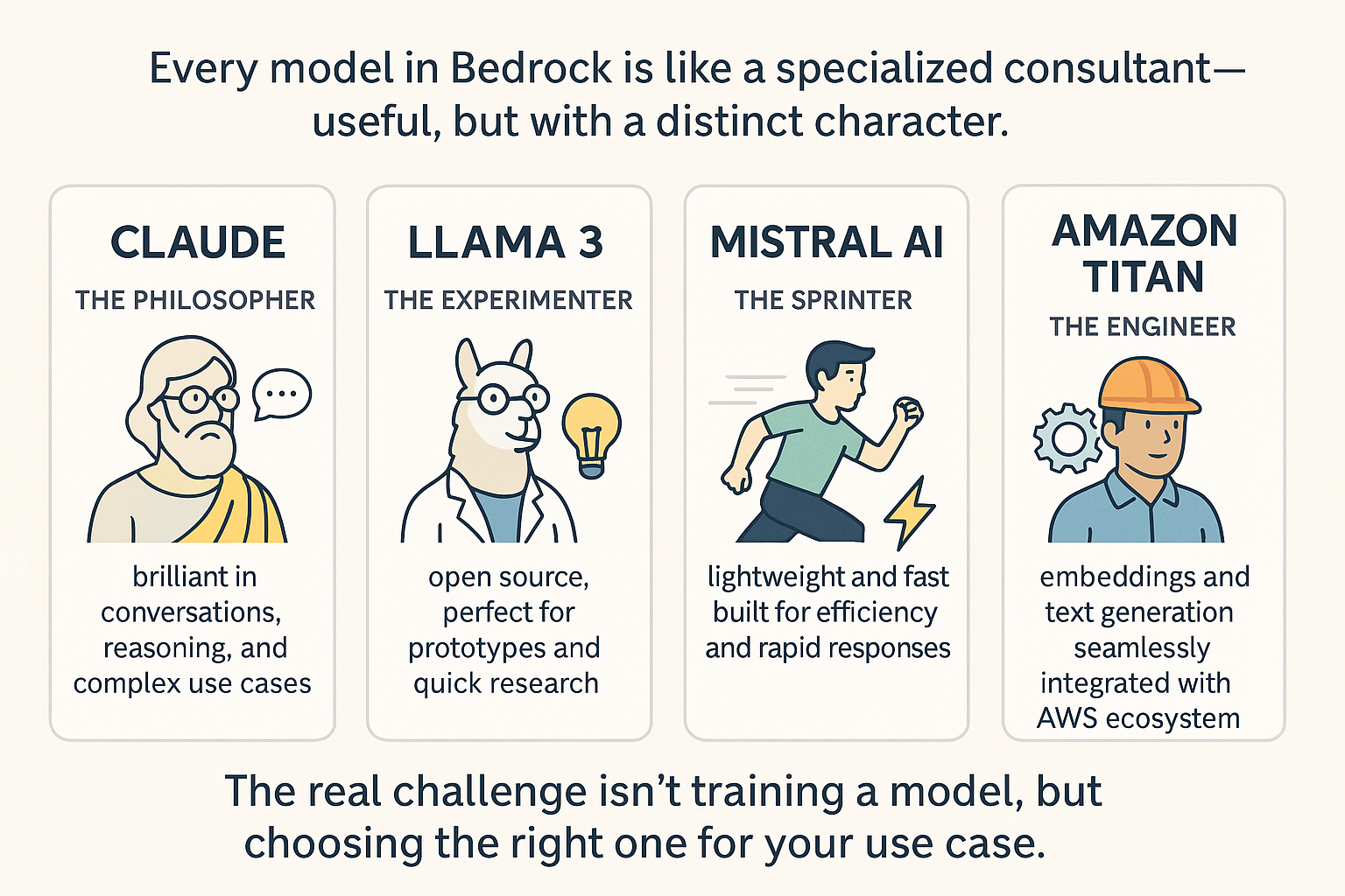 Every model in Bedrock is like a specialized consultant—useful, but with a distinct character.