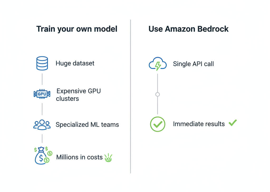 With Bedrock, you don’t get your hands dirty with GPUs or data centers. You make an API call, and it gives you intelligence back.