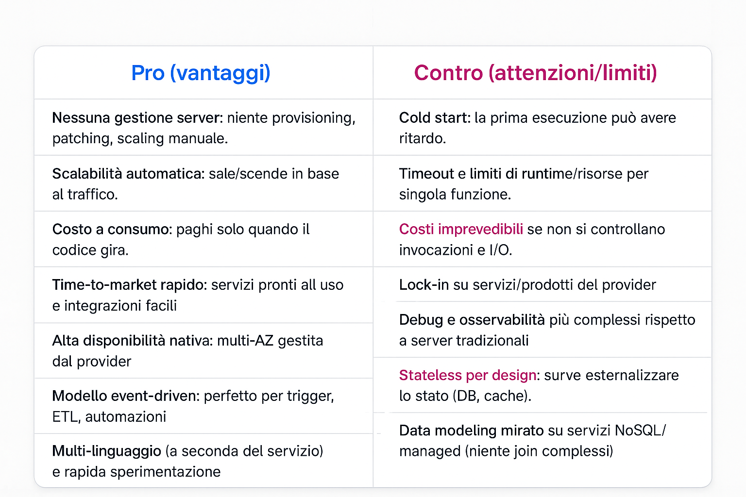 Limiti/attenzioni: cold start (ritardo alla prima esecuzione), timeout massimo per invocazione, file system effimero (/tmp), e lock-in su modelli/eventi AWS.