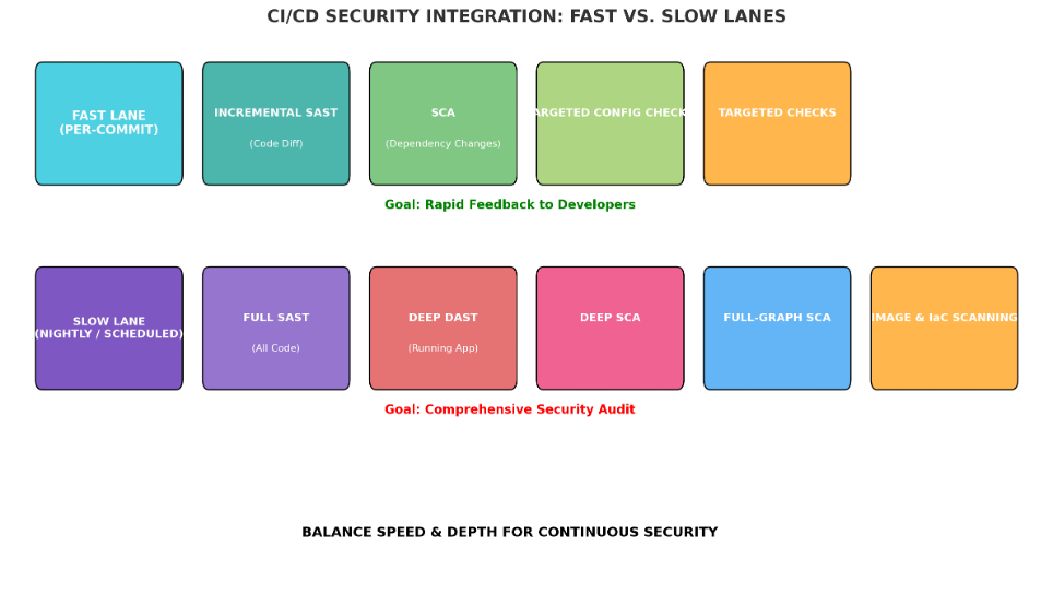 - Slow lane (nightly/scheduled): full SAST, deep DAST, full-graph SCA, image & IaC scanning.