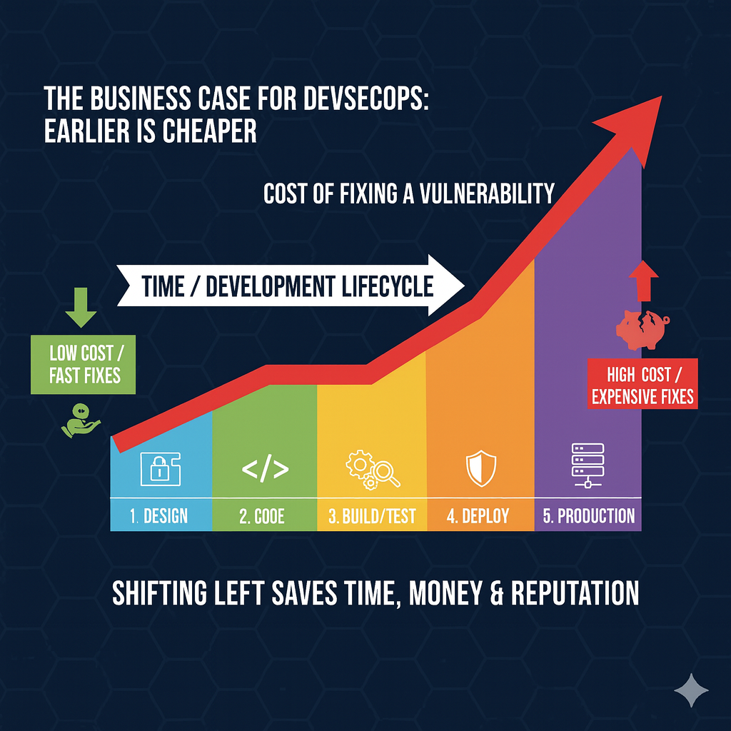 Production fixes are costly and risky; blocking a hardcoded API key at commit time is trivial. DevSecOps shortens the feedback loop and reduces average remediation cost per vuln. In a microservices world with frequent releases, that delta often decides whether you’re ahead or behind.