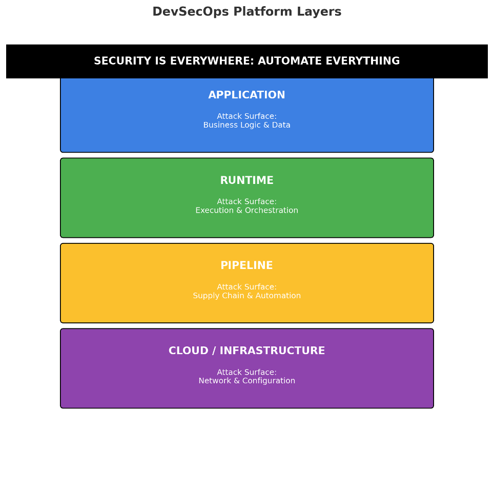 We no longer ship monoliths: microservices, APIs everywhere, external services, containers, Kubernetes, often in the cloud. Each layer expands the attack surface: app, runtime, pipeline, infrastructure. Your security posture is the real state (not the assumed one) of this stack. DevSecOps exists to measure that posture, highlight issues, and drive remediation.