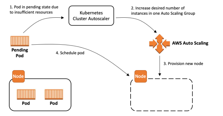 Questa “attesa” è il momento in cui il Cluster Autoscaler entra in scena: monitora i pod non schedulabili e cerca di espandere il cluster aggiungendo nuove istanze EC2.