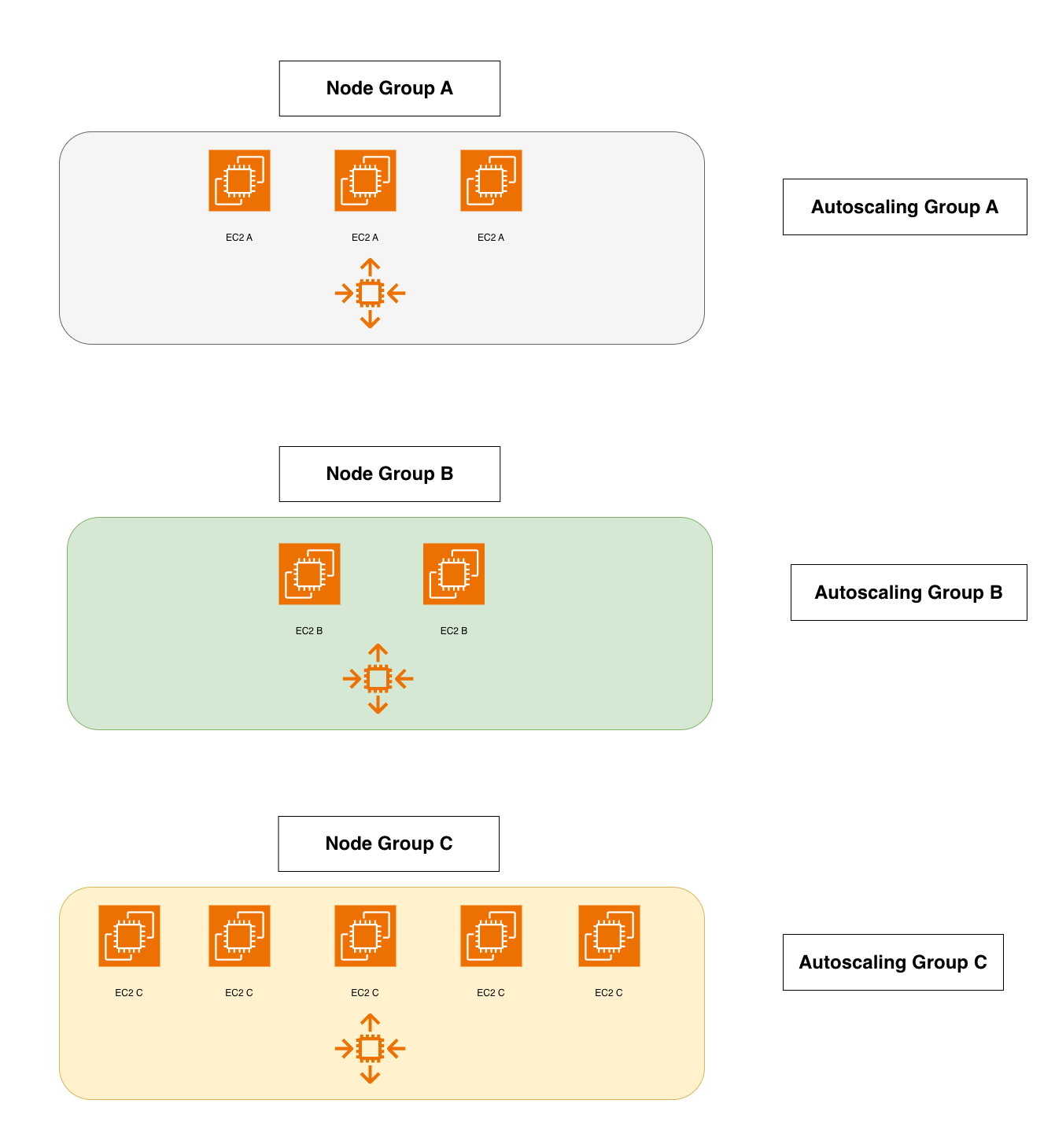 Ogni node group deve essere definito in anticipo, con un tipo di istanza fisso e dimensioni uniformi (best practice AWS EKS Cluster Autoscaler).