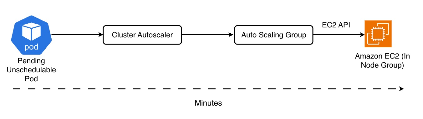 Ogni volta che un pod resta unschedulable, invoca un Auto Scaling Group di EC2, che a sua volta crea un’istanza. Questo passaggio — CA → ASG → EC2 — introduce latenza.