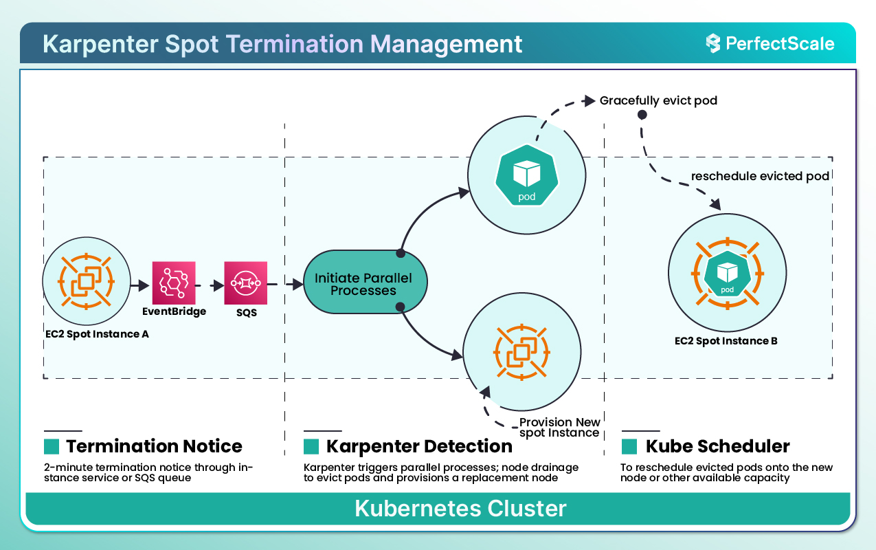 Karpenter ascolta gli eventi di EventBridge, intercetta il segnale di spot interruption, e in quei 120 secondi provvede a fare il provisioning di un nuovo nodo — decidendo se usare ancora Spot o passare a On-Demand, in base al costo e alla disponibilità (documentazione ufficiale).