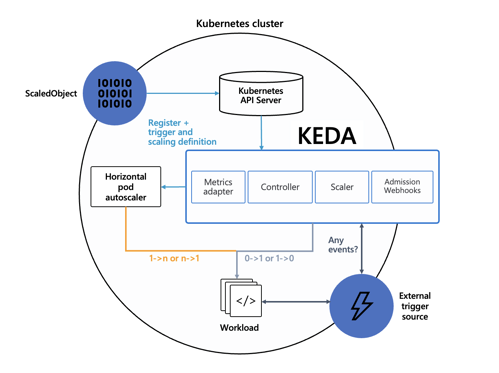 KEDA (Kubernetes Event-Driven Autoscaling) è un operatore Kubernetes che estende HPA fornendo metriche esterne derivate da sistemi di eventi.