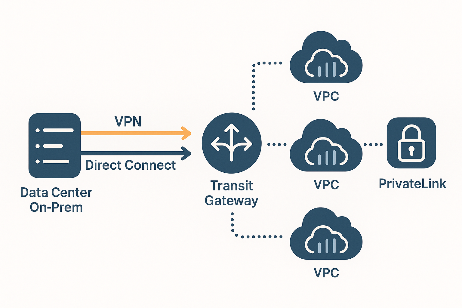 - Una combinazione dei due, orchestrata con Transit Gateway e, per l’esposizione di servizi, PrivateLink.